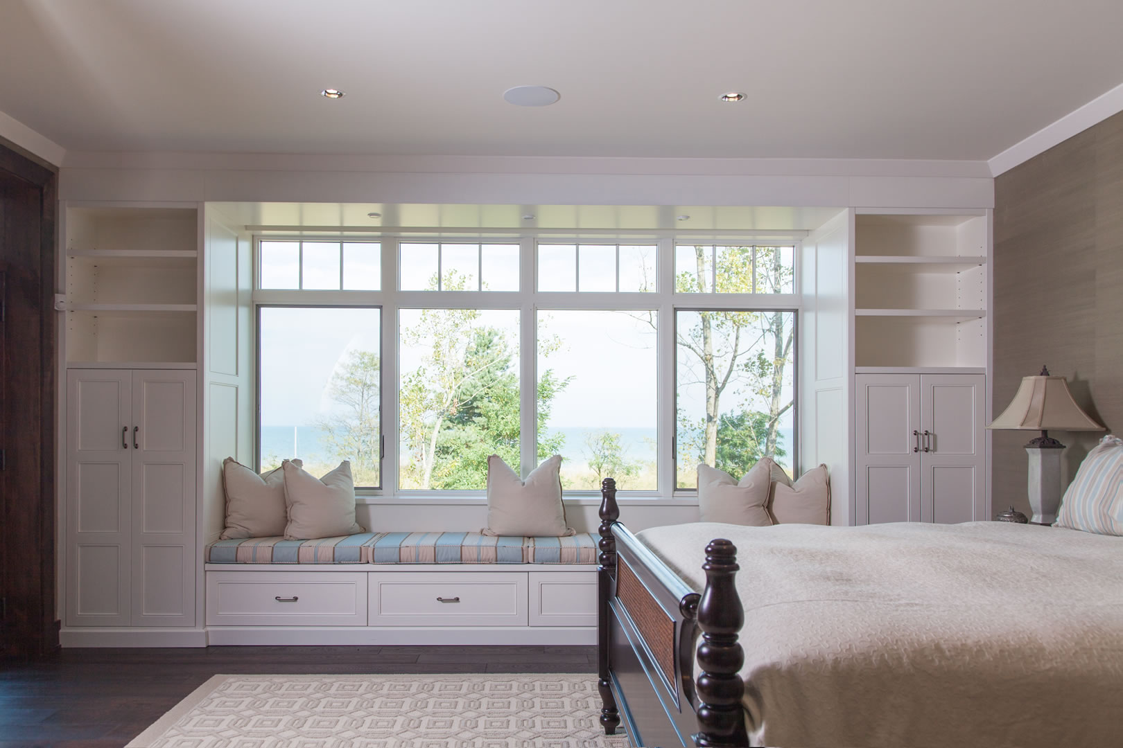 The bedroom overlooks the lake through expansive windows. A cushioned window bench in blue and white striped fabric, flanked by white built-in storage cabinets, adds to the beach and lake ambiance.