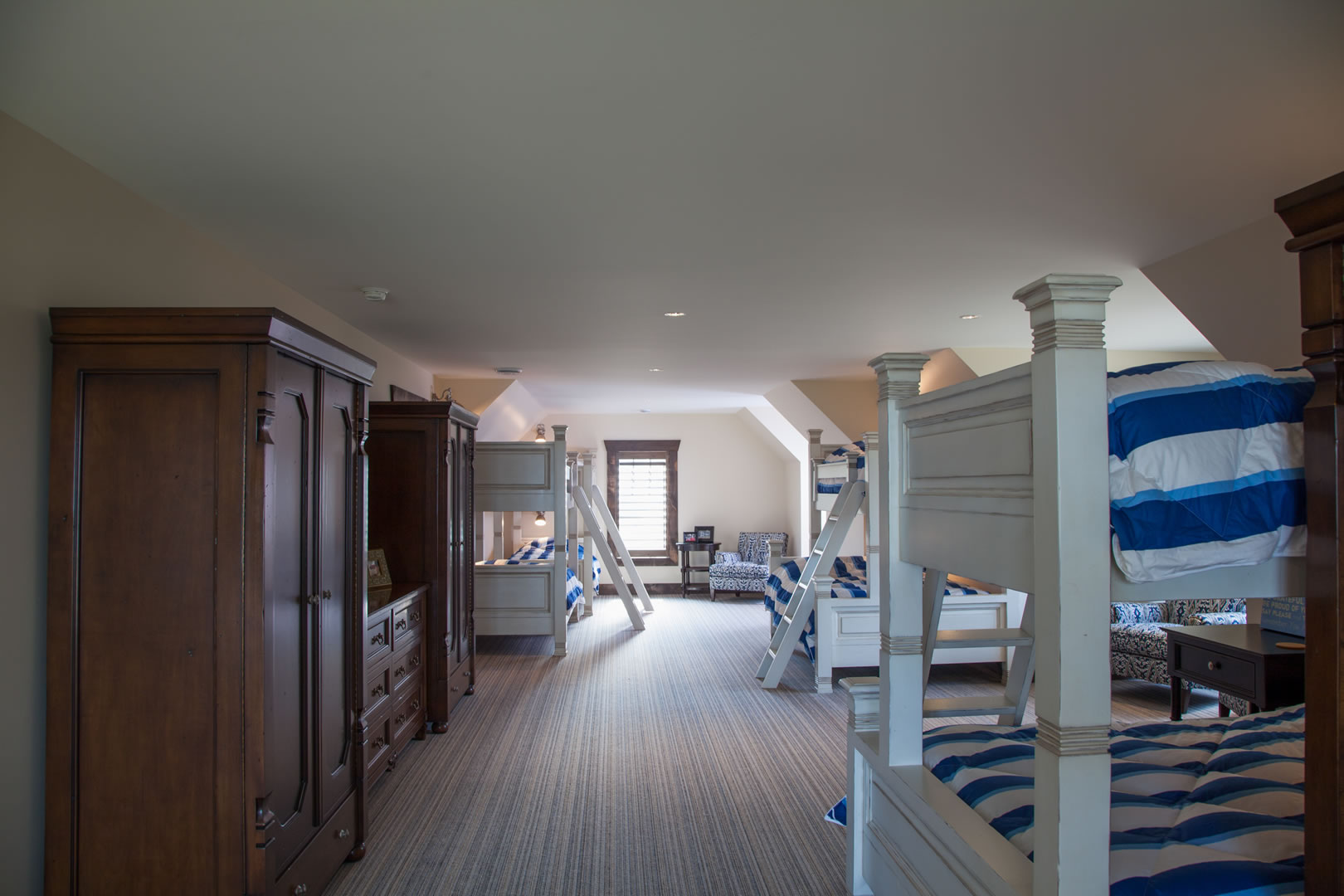 The client’s large family was the inspiration for a dormitory that stretches across one end of the upper level. With six bunk beds and two queen-size beds, it can accommodate 16 to 18 youngsters.