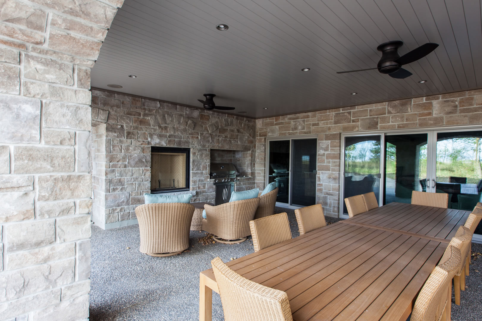 The room opens to a large covered patio beneath the great room. It features a barbecue and outdoor kitchen and a wood-burning fireplace. A fire pit just beyond provides a perfect place to enjoy the summer evenings.