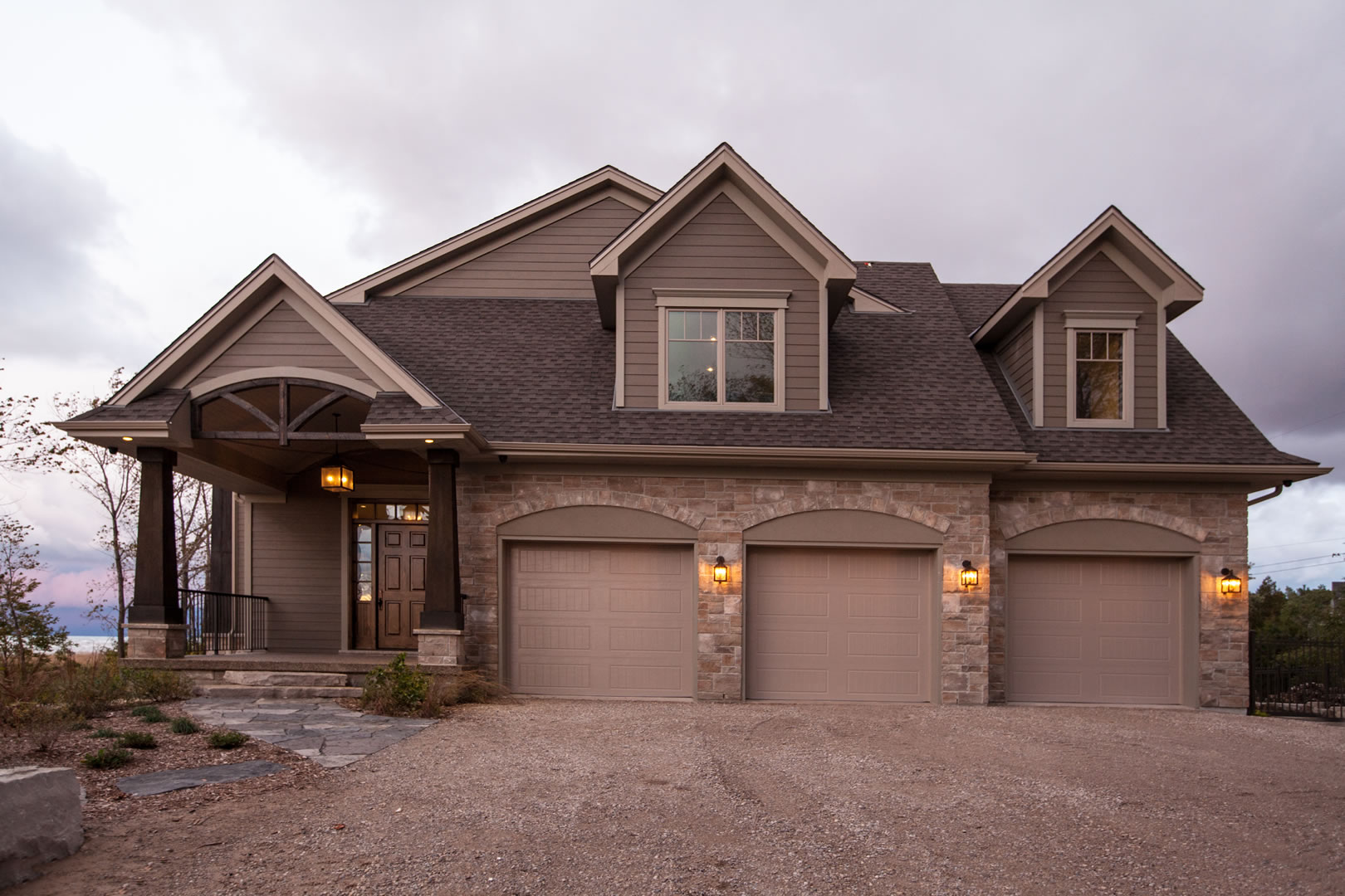 Its exterior walls are concrete, constructed with insulated concrete forms, a specialty for Oke Woodsmith, clad with Permacon manufactured stone and James Hardie fibre cement board siding. It includes geothermal heating. The interior oak floors, installed by Hucker Floor Coverings from Sarnia, are heated for additional comfort.