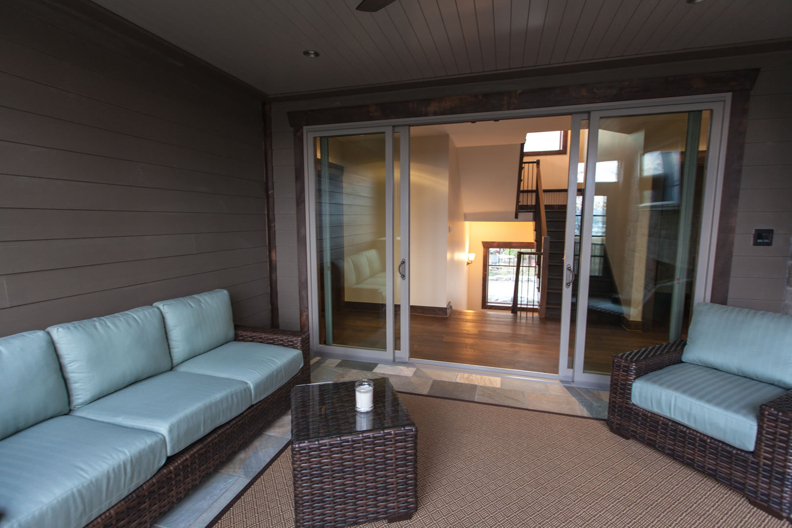 Gordon says this is yet another way to create the transparency between outdoors and indoors. He adds that the porch’s screening system, another innovation suggested by Oke Woodsmith, makes it versatile through the seasons. “It’s very clever,” he says. “It’s retractable glass. You can have a screen or glass, so it can be sheltered from the wind and elements.”
