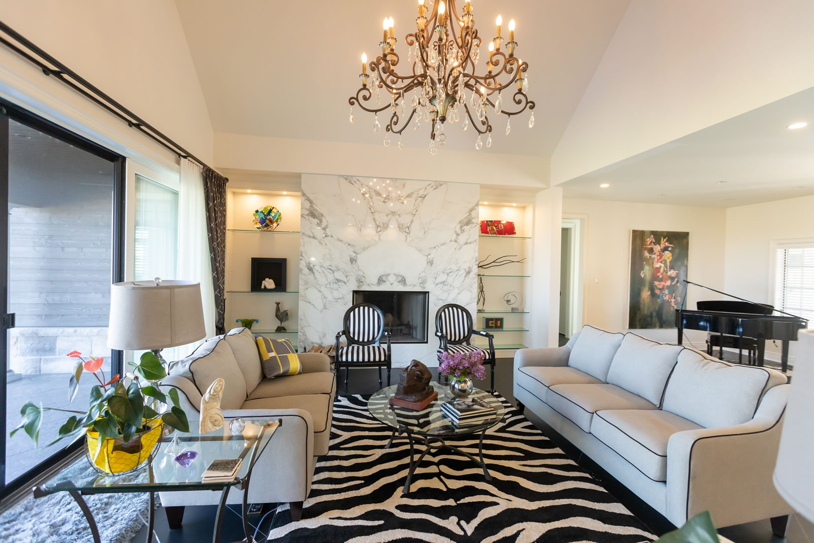 The black and white scheme repeats throughout in area rugs, quartz counters and fireplace, striped upholstery and white cabinets.
