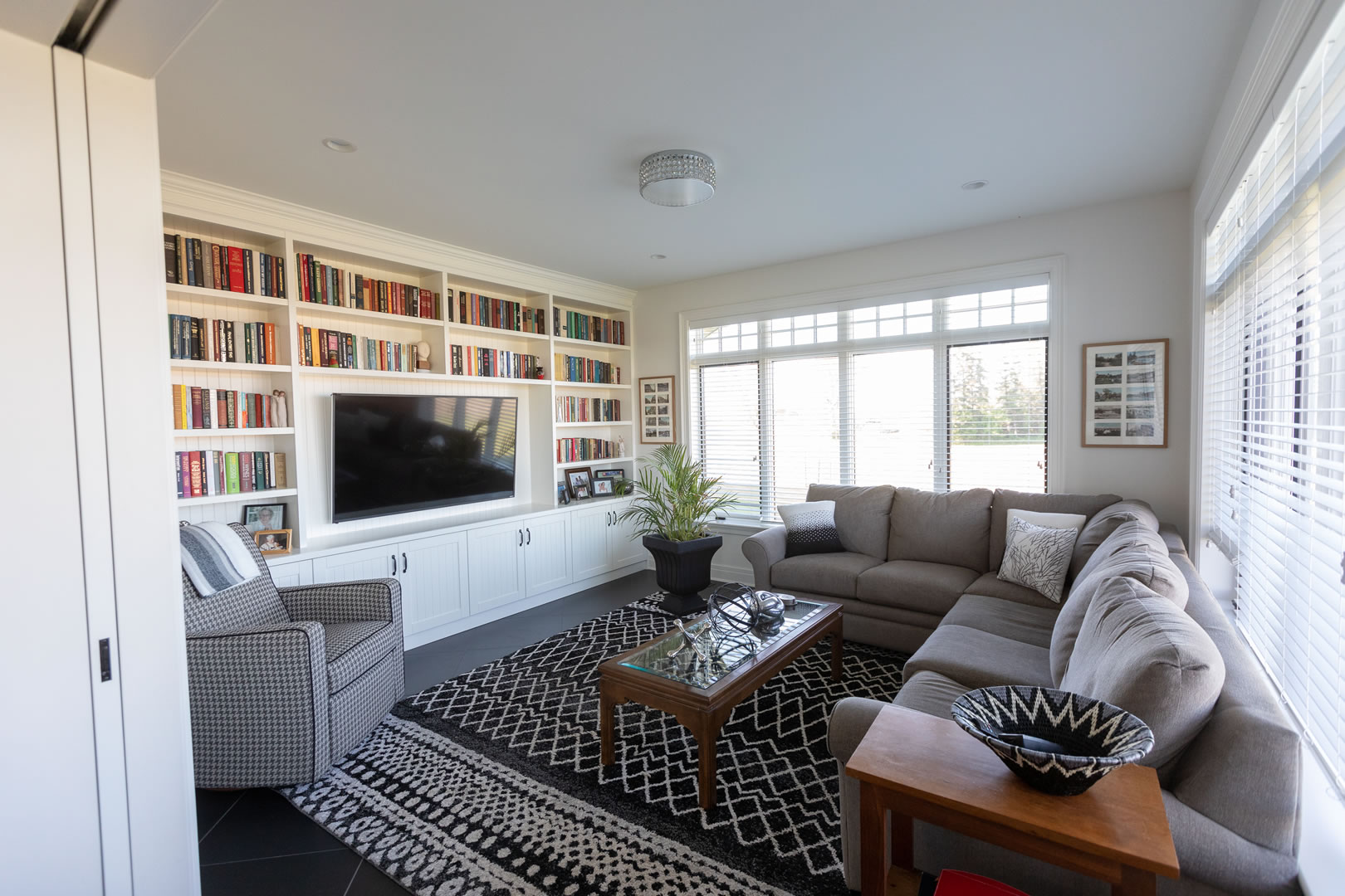 Glass pocket doors can cocoon the library/television room off the dining area. “It’s a great room to read in because of the light. I’m an avid reader and always wanted a library,” says Suzanne.