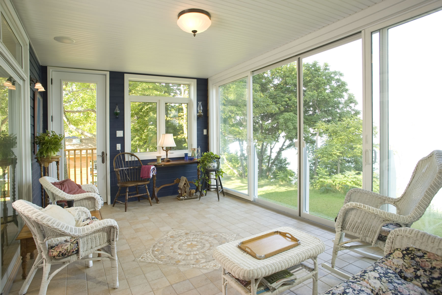 The dining area, furnished with a round mahogany table and four chairs, opens out to a spacious sunroom. It was originally planned as a covered porch until the Halls realized their idea wasn’t practical because of the winds off the lake. Patio doors that open to an eight-foot width now provide a seemingly limitless view of the lake.