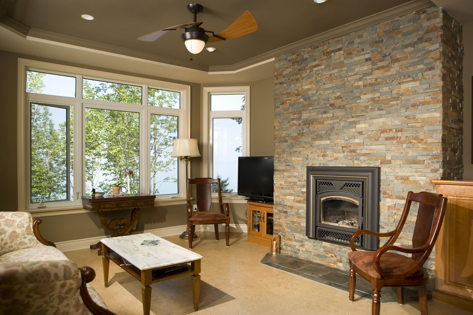 The colours of nature used in the kitchen are repeated in the dry stacked stone fireplace surround in the living room. Beside the fireplace, a cherry cabinet conceals a motorized lift that brings firewood up from the garage. An angled wall of windows in the living room and the master bedroom directly above it capture views of the lake.